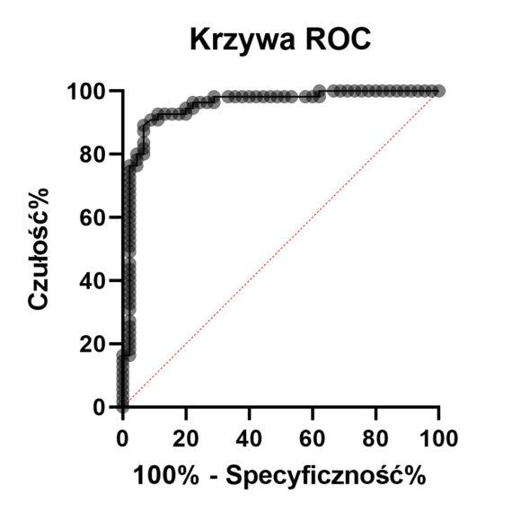 - Pole powierzchni pod krzywą ROC (AUC – Area Under the ROC Curve) mierzy ogólną jakość testu. Im większa wartość AUC, tym test jest bardziej skuteczny.